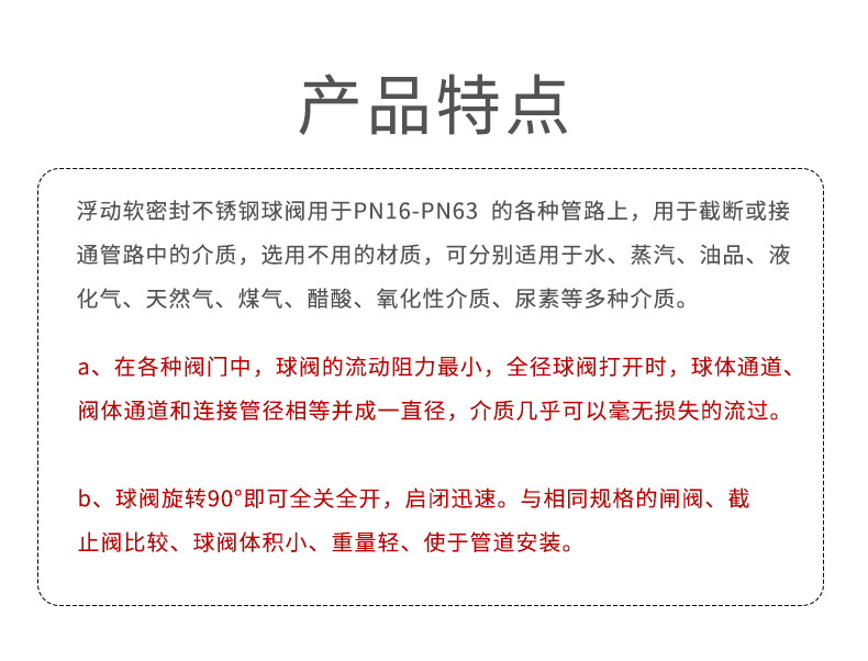 浮动软密封不锈钢球阀用于PN16-PN63 的各种管路上,用于截断或接通管路中的介质,选用不用的材质,可分别适用于水、蒸汽、油品、液化气、天然气、煤气、醋酸、氧化性介质、尿素等多种介质。