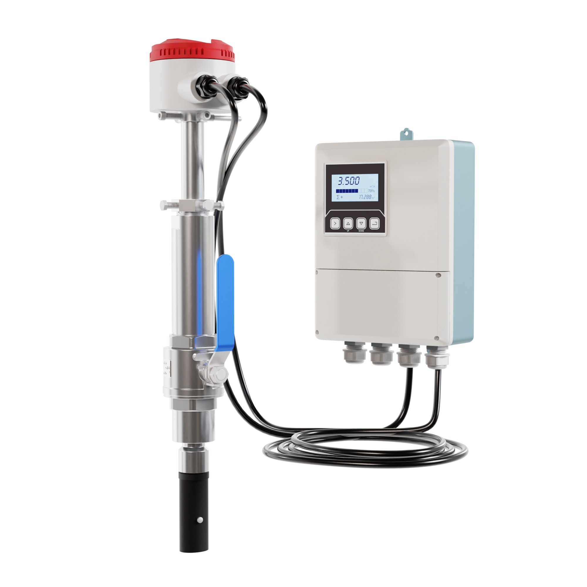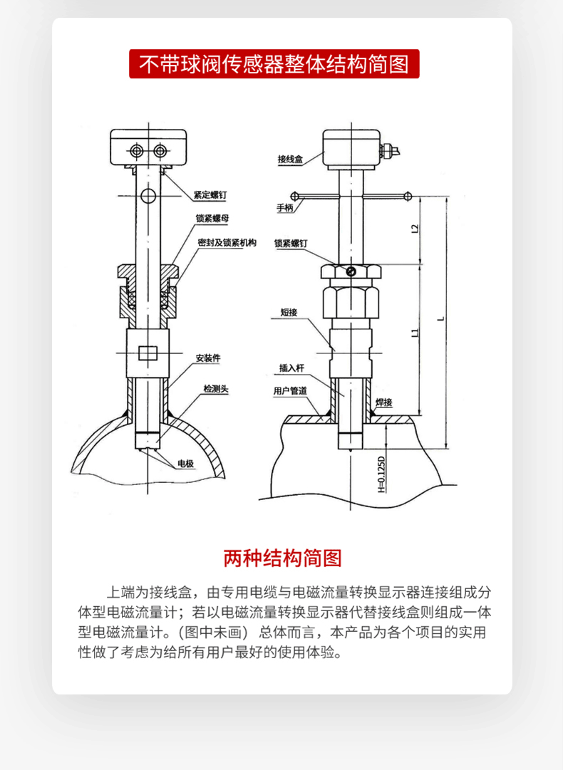 LDGC-MIK插入式电磁流量计在工业、农业、水利、环保污水监测、城市供水等各个部门用来测量各种导电液体的流量和总量。相比管道式的流量计而言插入式的电磁流量计的测量不受流体密度、粘度、温度、压力和电导率等变化的影响。采用先进的励磁技术,功耗小,零点稳定,抗干扰能力强、可靠性好。无附加压力损失,要求直管段长度小,相对安装也比较简单。量测量量程宽,满量程流速可在1.0m/s—10.0m/s内连续任意设定, 输出信号与流量(流速)成完全线性关系。