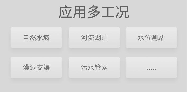 本产品是在自然水域中测量水的流速、水位的仪表。测距雷达单元工作频率为 80GHz,测速雷达单元工作频率为 24GHz。测量点在机体前方,不破坏流场,适用于泥沙悬浮物含量高、水草等漂浮物多和极其严苛的冰期场合的河流中测量。可广泛适用于水位测站、灌溉支渠、污雨水管网等流量监测。