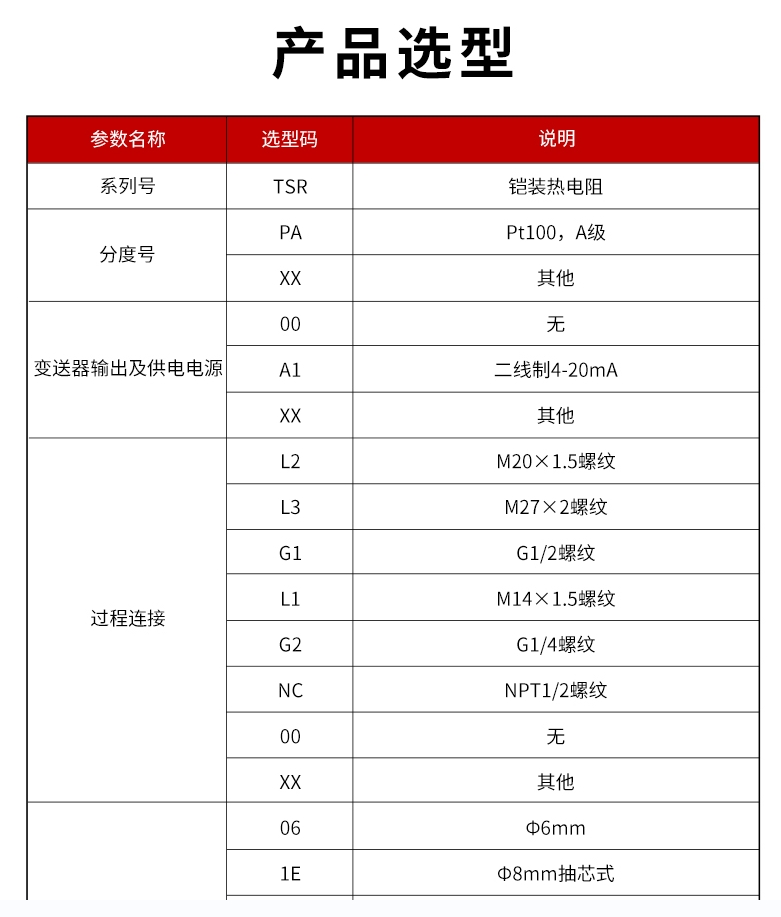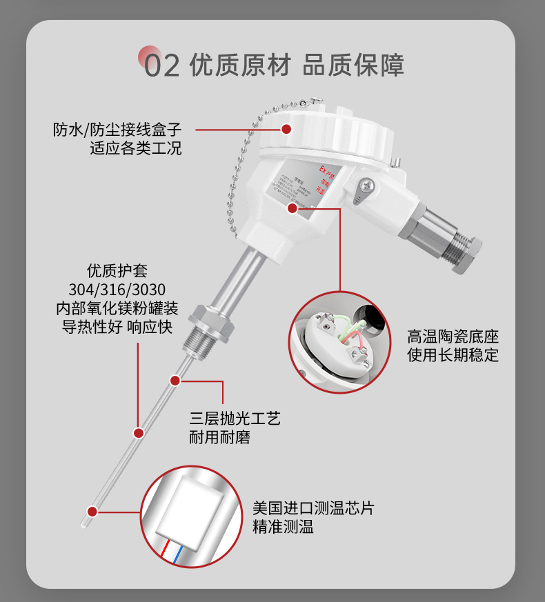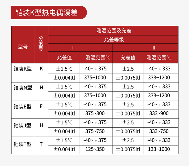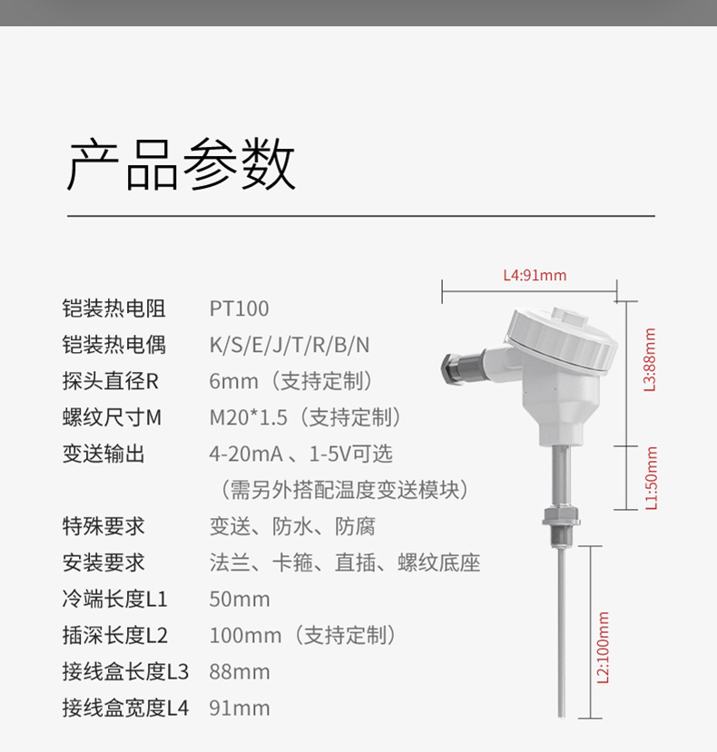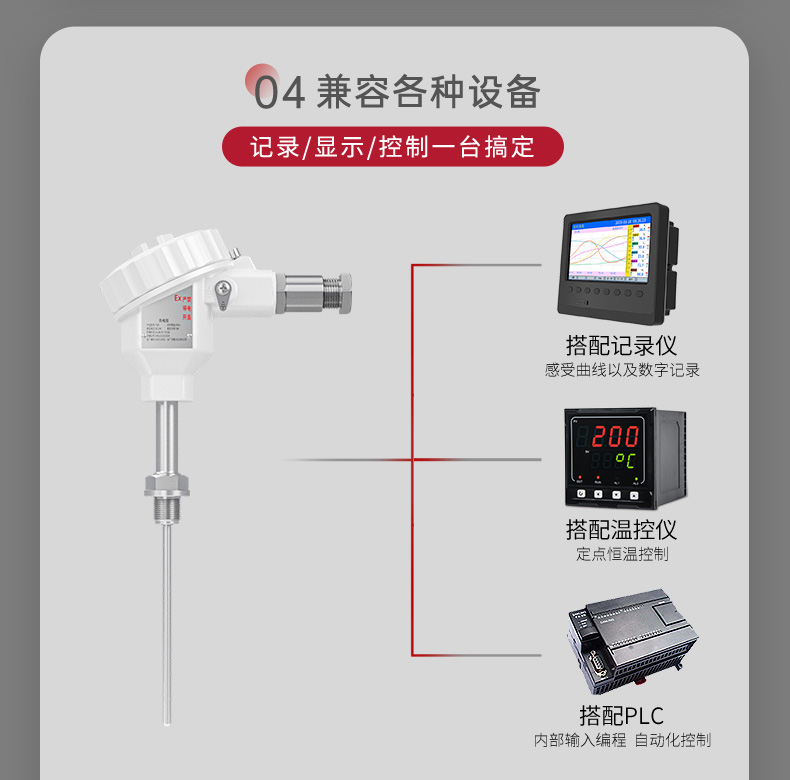 隔爆铠装热电阻MIK-TSR/热电偶MIK-TSRG隔爆温度传感器全部采用的进口芯体,采用不锈钢外壳,从而达到稳定性好,精度高,抗震性能强等特点。目前市场上热电阻主要是Pt100,热电偶主要是K型、T型、S型、R型、B型、N型、E型、J型等8种常规型号,具体现场需要热电阻还是热电偶,主要根据现场测温精度与测温范围确定。 铠装温度传感器可以测量液体、蒸汽和气体介质以及固体表面温度,广泛应用于工业自动化设备配套及石油、化工、冶金、电力等过程控制领域。