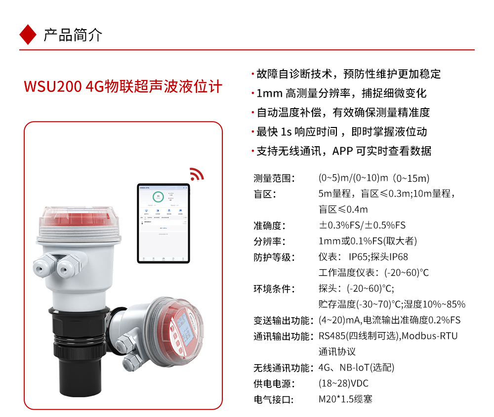 yth2206游艇会WSU-200 4G物联超声波液位计具有高可靠性、高性价比、易安装维护的液位/物位测量仪器,可广泛用于各种液体和固体物料高度的测量。本产品可选配 NB-IoT 无线通讯功能,用户可在仪表云平台进行数据查看和远程监控。常见的应用工况,如市政、化工、储运等工业环境中的河流、水池、储罐等液位测量。咨询热线:400-152-1718